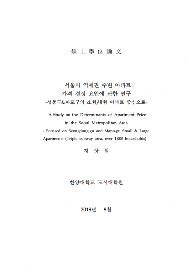 서울시 역세권 주변 아파트 가격 결정 요인에 관한연구 –성동구&마포구외 소형/대형 아파트 중심으로- > thesis_master