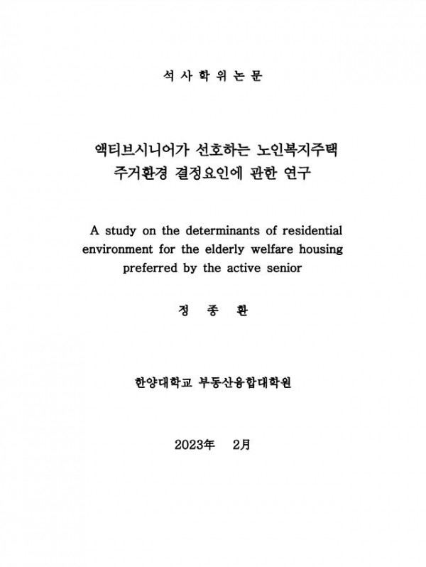 액티브시니어가 선호하는 노인복지주택 주거환경 결정요인에 관한 연구 > thesis_master