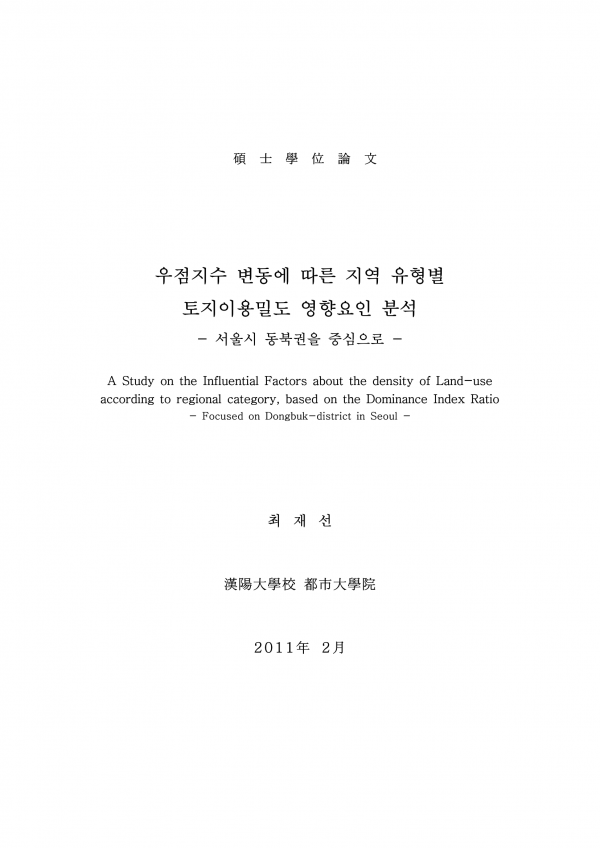 우점지수 변동에 따른 지역 유형별 토지이용밀도 영향요인 분석 서울시 동북권을 중심으로 > thesis_master