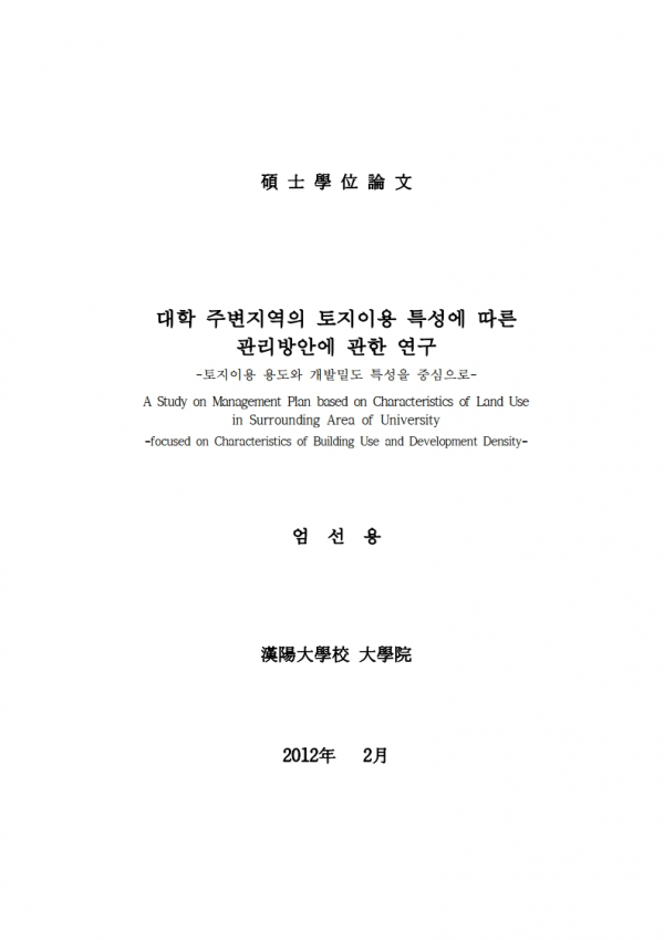 대학 주변지역의 토지이용 특성에 따른 관리방안에 관한 연구 토지이용 용도와 개발밀도 특성을 중심으로 > thesis_master