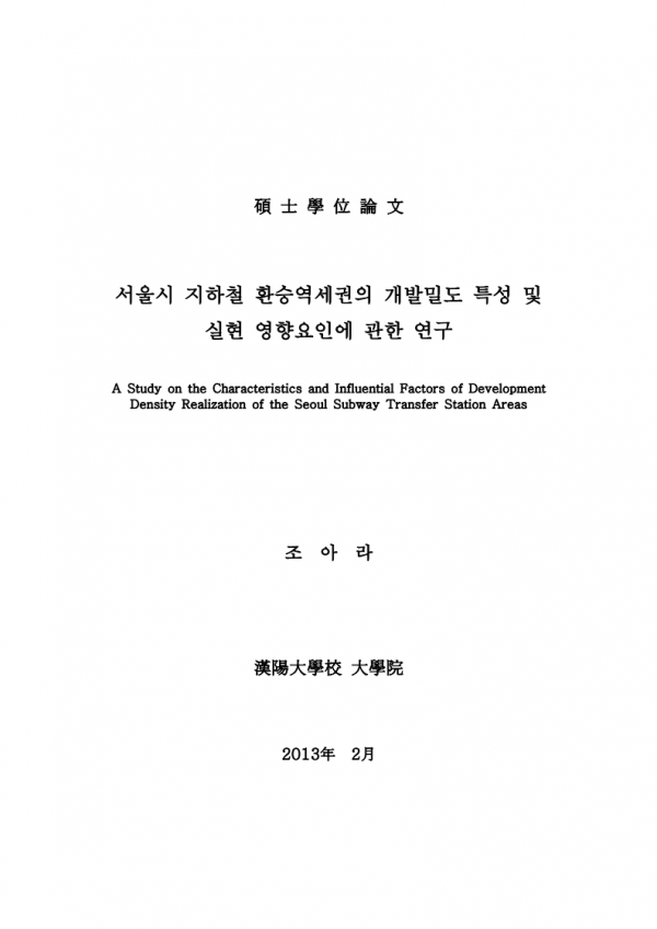 서울시 지하철 환승역세권의 개발밀도 특성 및 실현 영향요인에 관한 연구 > thesis_master