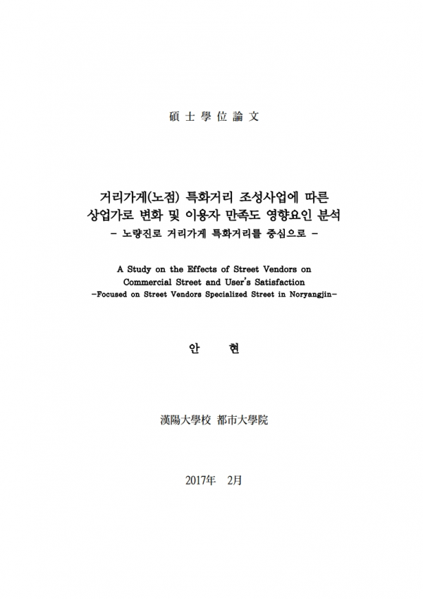 페이지 정보 본문 [거리가게(노점) 특화거리 조성사업에 따른 상업가로 변화 및 이용자 만족도 영향요인 분석 노량진로 거리가게 특화거리를 중심으로] 안현(2017) 석사학위논문 관련링크 이전글 다음글 목록
