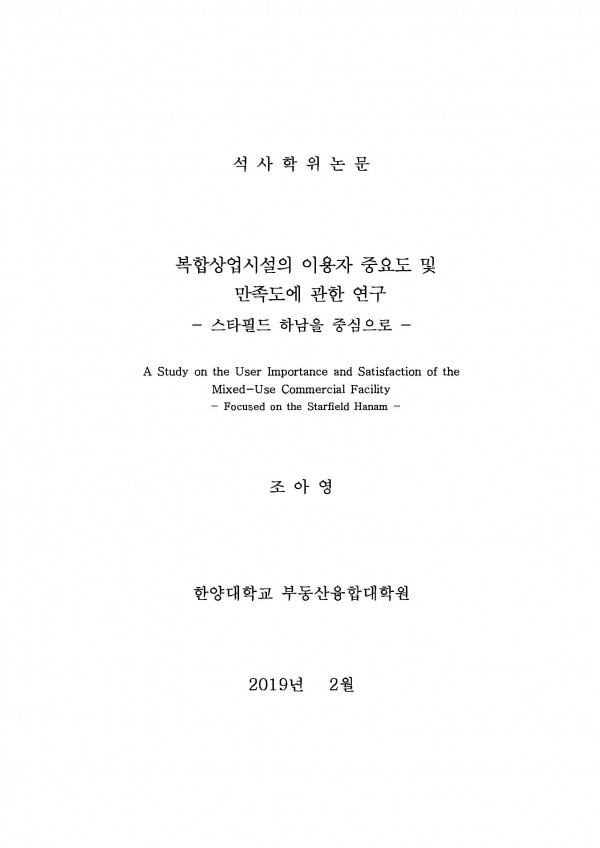 복합상업시설의 이용자 중요도 및 만족도에 관한 연구 : 스타필드 하남을 중심으로 > thesis_master
